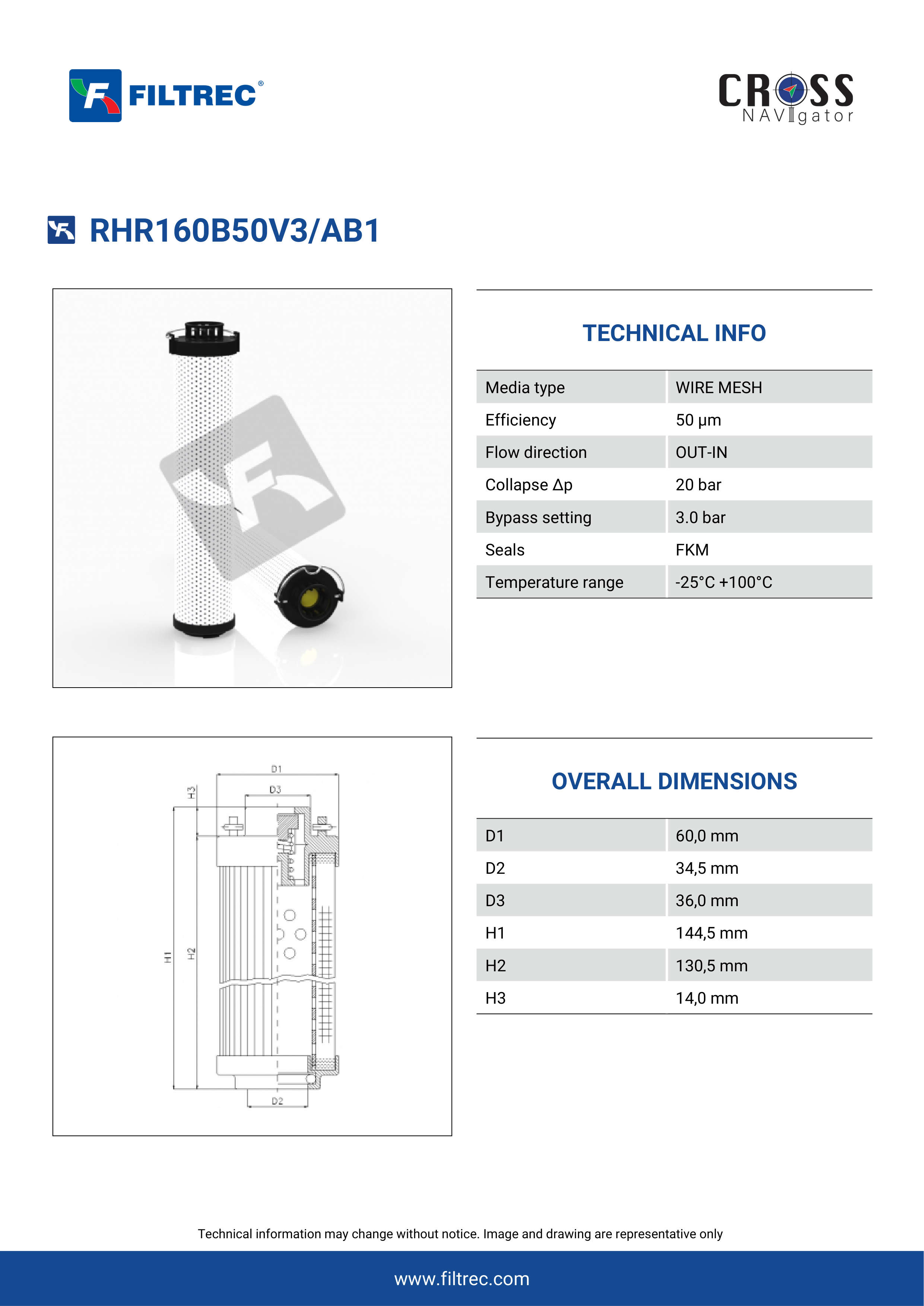 Genuine Filtrec RHR160B50V3/AB1. This Filtrec element is designed to meet or exceed the quality and performance of brand OEM’s ensuring superior filtration performance and long-lasting durability.Engineered with their high performance media and a durable design, the RHR160B50V3/AB1 provides reliable and consistent performance over its lifespan, even in harsh operating environments. When you order from FilterFinder, you can trust that you are getting a reliable and high-quality replacement filter that will keep your system running smoothly.