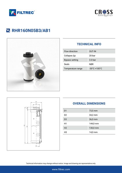 Genuine Filtrec RHR160N05B3/AB1. This Filtrec element is designed to meet or exceed the quality and performance of brand OEM’s ensuring superior filtration performance and long-lasting durability.Engineered with their high performance media and a durable design, the RHR160N05B3/AB1 provides reliable and consistent performance over its lifespan, even in harsh operating environments. When you order from FilterFinder, you can trust that you are getting a reliable and high-quality replacement filter that will keep your system running smoothly.