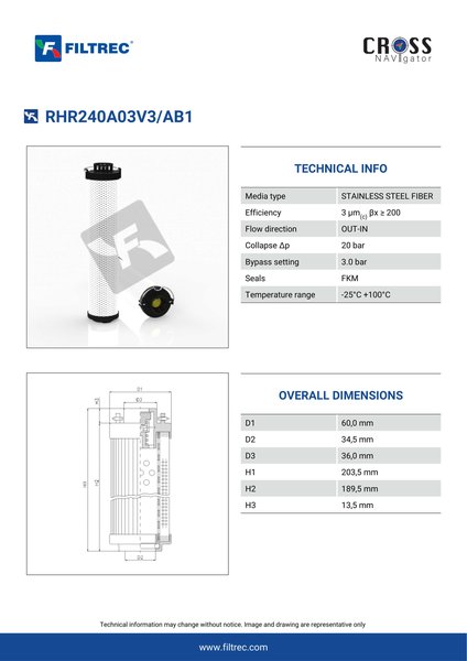Genuine Filtrec RHR240A03V3/AB1. This Filtrec element is designed to meet or exceed the quality and performance of brand OEM’s ensuring superior filtration performance and long-lasting durability.Engineered with their high performance media and a durable design, the RHR240A03V3/AB1 provides reliable and consistent performance over its lifespan, even in harsh operating environments. When you order from FilterFinder, you can trust that you are getting a reliable and high-quality replacement filter that will keep your system running smoothly.