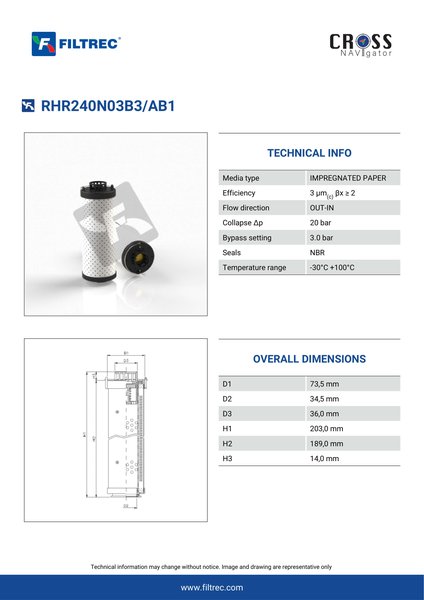 Genuine Filtrec RHR240N03B3/AB1. This Filtrec element is designed to meet or exceed the quality and performance of brand OEM’s ensuring superior filtration performance and long-lasting durability.Engineered with their high performance media and a durable design, the RHR240N03B3/AB1 provides reliable and consistent performance over its lifespan, even in harsh operating environments. When you order from FilterFinder, you can trust that you are getting a reliable and high-quality replacement filter that will keep your system running smoothly.