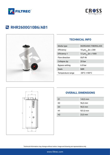 Genuine Filtrec RHR2600G10B6/AB1. This Filtrec element is designed to meet or exceed the quality and performance of brand OEM’s ensuring superior filtration performance and long-lasting durability.Engineered with their high performance media and a durable design, the RHR2600G10B6/AB1 provides reliable and consistent performance over its lifespan, even in harsh operating environments. When you order from FilterFinder, you can trust that you are getting a reliable and high-quality replacement filter that will keep your system running smoothly.