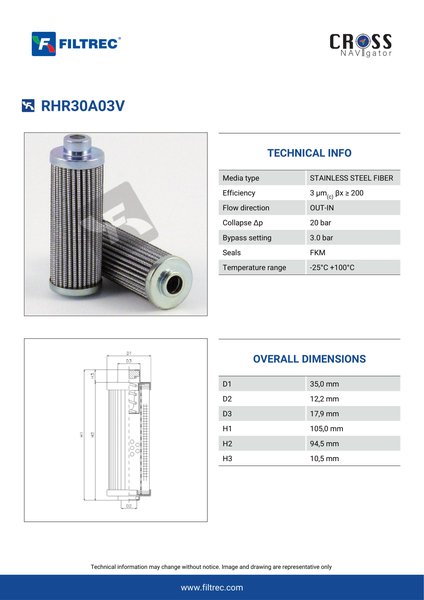 Engineered with their high performance media and a durable design, the RHR30A03V provides reliable and consistent performance over its lifespan, even in harsh operating environments. When you order from FilterFinder, you can trust that you are getting a reliable and high-quality replacement filter that will keep your system running smoothly.