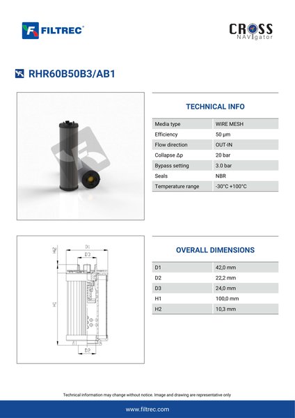 Genuine Filtrec RHR60B50B3/AB1. This Filtrec element is designed to meet or exceed the quality and performance of brand OEM’s ensuring superior filtration performance and long-lasting durability.Engineered with their high performance media and a durable design, the RHR60B50B3/AB1 provides reliable and consistent performance over its lifespan, even in harsh operating environments. When you order from FilterFinder, you can trust that you are getting a reliable and high-quality replacement filter that will keep your system running smoothly.