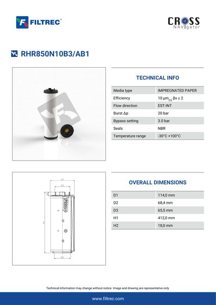 Engineered with their high performance media and a durable design, the RHR850N10B3/AB1 provides reliable and consistent performance over its lifespan, even in harsh operating environments. When you order from FilterFinder, you can trust that you are getting a reliable and high-quality replacement filter that will keep your system running smoothly.