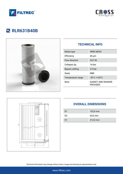 Genuine Filtrec RLR631B40B. This Filtrec element is designed to meet or exceed the quality and performance of brand OEM’s ensuring superior filtration performance and long-lasting durability.