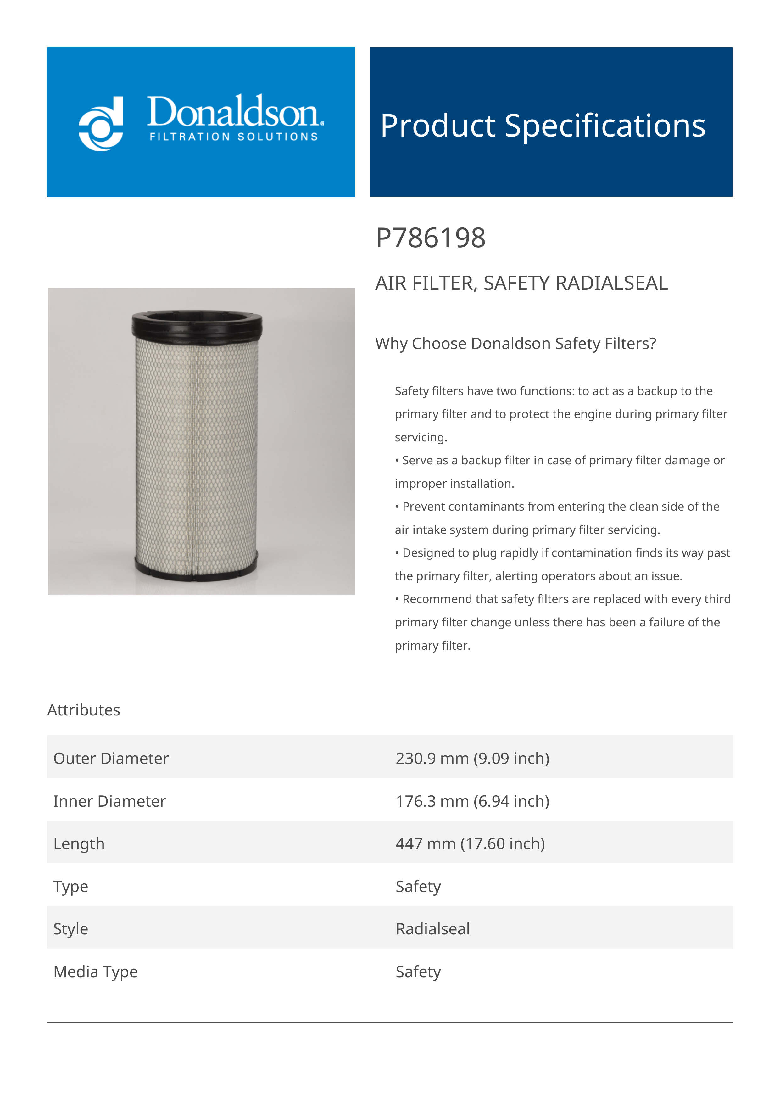 Why Choose Donaldson Safety Filters?Safety filters have two functions: to act as a backup to the primary filter and to protect the engine during primary filter servicing.