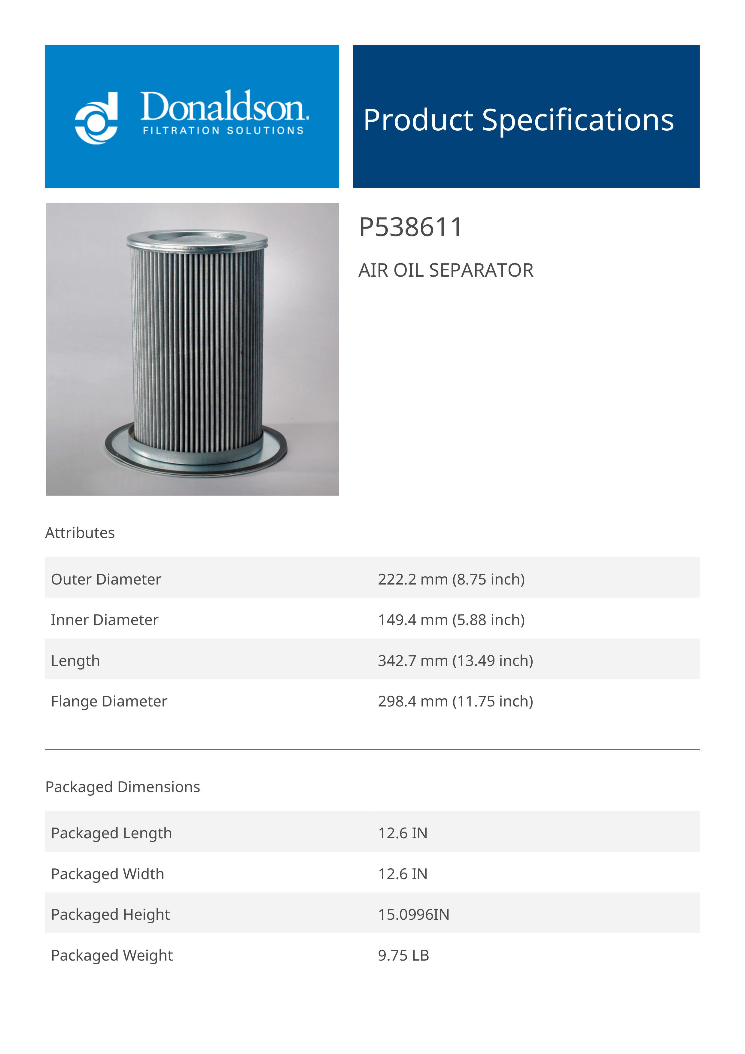 Genuine Donaldson P538611 Air Oil Separator is designed to separate oil from compressed air systems, reducing oil carryover and improving air quality. It enhances system efficiency and protects downstream equipment.
