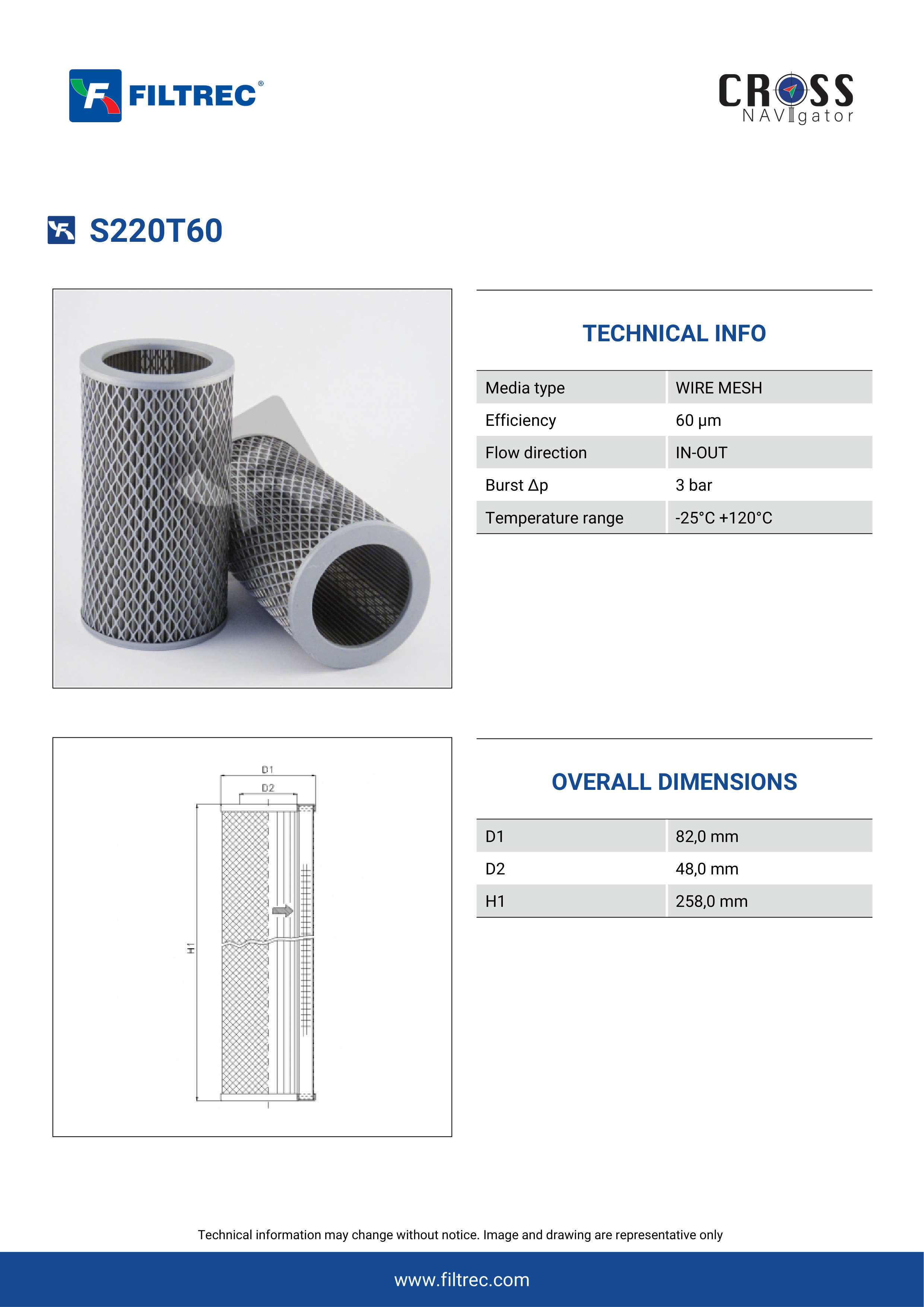 Genuine Filtrec S220T60. This Filtrec element is designed to meet or exceed the quality and performance of brand OEM’s ensuring superior filtration performance and long-lasting durability.