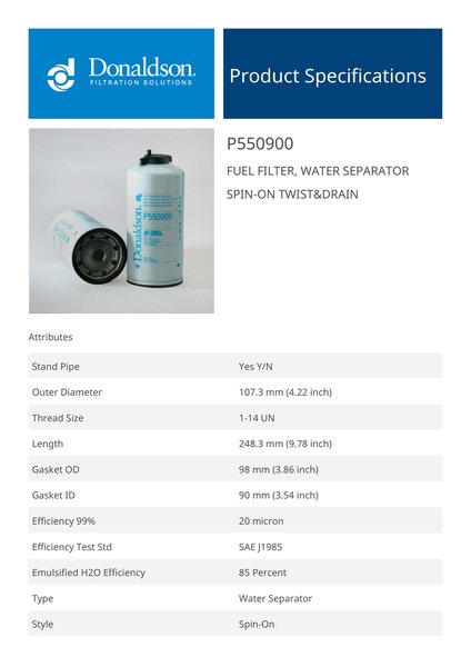 Genuine Donaldson P550900 Fuel Filter, Water Separator Spin-On Twist&Drain effectively separates water and contaminants from diesel fuel, ensuring clean fuel delivery and preventing engine damage. Its twist-and-drain feature allows for easy water removal.