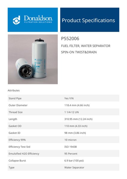Genuine Donaldson P552006 Fuel Filter, Water Separator Spin-On Twist&Drain effectively separates water and contaminants from diesel fuel, ensuring clean fuel delivery and preventing engine damage. Its twist-and-drain feature allows for easy water removal.