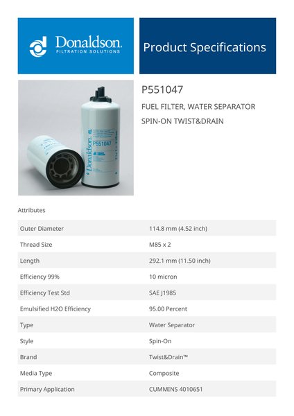 Genuine Donaldson P551047 Fuel Filter, Water Separator Spin-On Twist&Drain effectively separates water and contaminants from diesel fuel, ensuring clean fuel delivery and preventing engine damage. Its twist-and-drain feature allows for easy water removal.