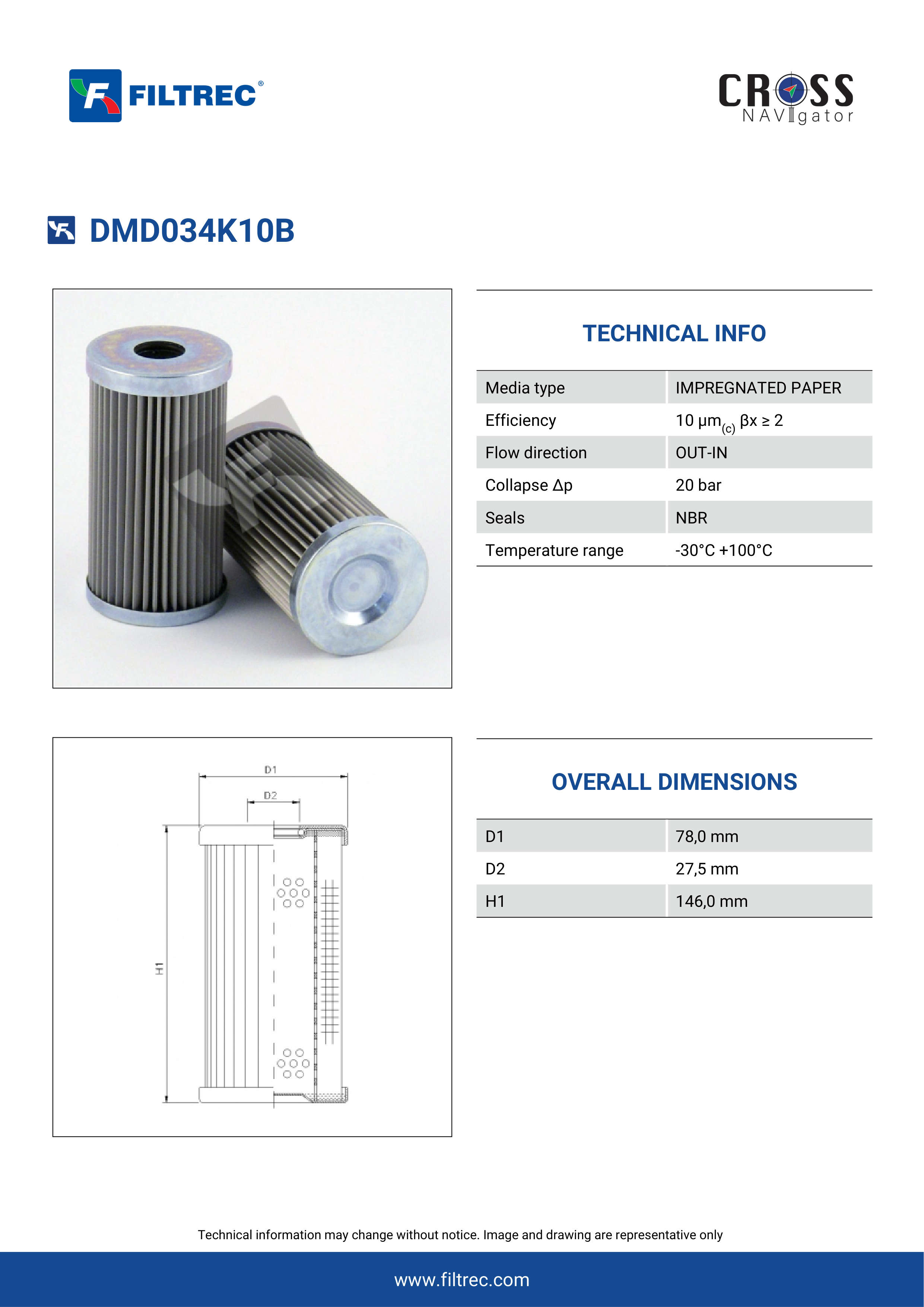 Genuine Filtrec DMD034K10B. This Filtrec element is designed to meet or exceed the quality and performance of brand OEM’s ensuring superior filtration performance and long-lasting durability.