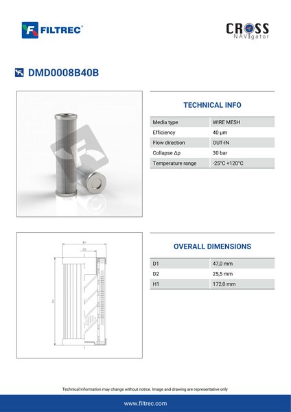 Genuine Filtrec DMD0008B40B. This Filtrec element is designed to meet or exceed the quality and performance of brand OEM’s ensuring superior filtration performance and long-lasting durability.