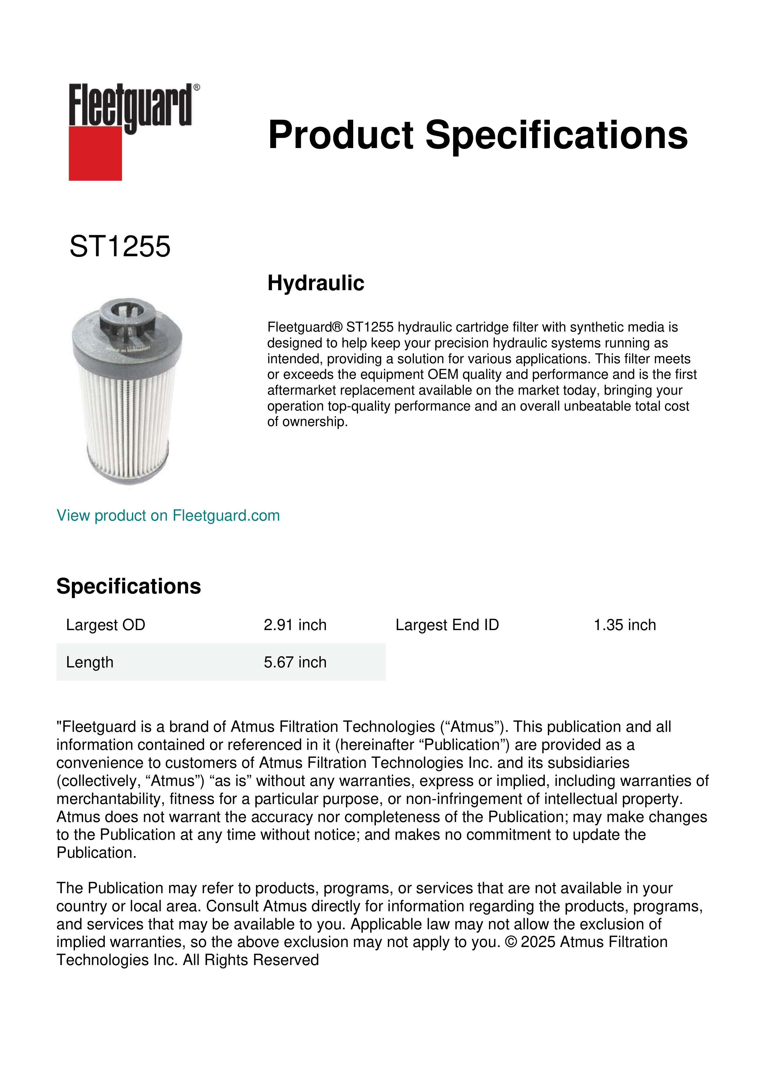 Fleetguard® ST1255 hydraulic cartridge filter with synthetic media is designed to help keep your precision hydraulic systems running as intended, providing a solution for various applications. This filter meets or exceeds the equipment OEM quality and performance and is the first aftermarket replacement available on the market today, bringing your operation top-quality performance and an overall unbeatable total cost of ownership.Specification