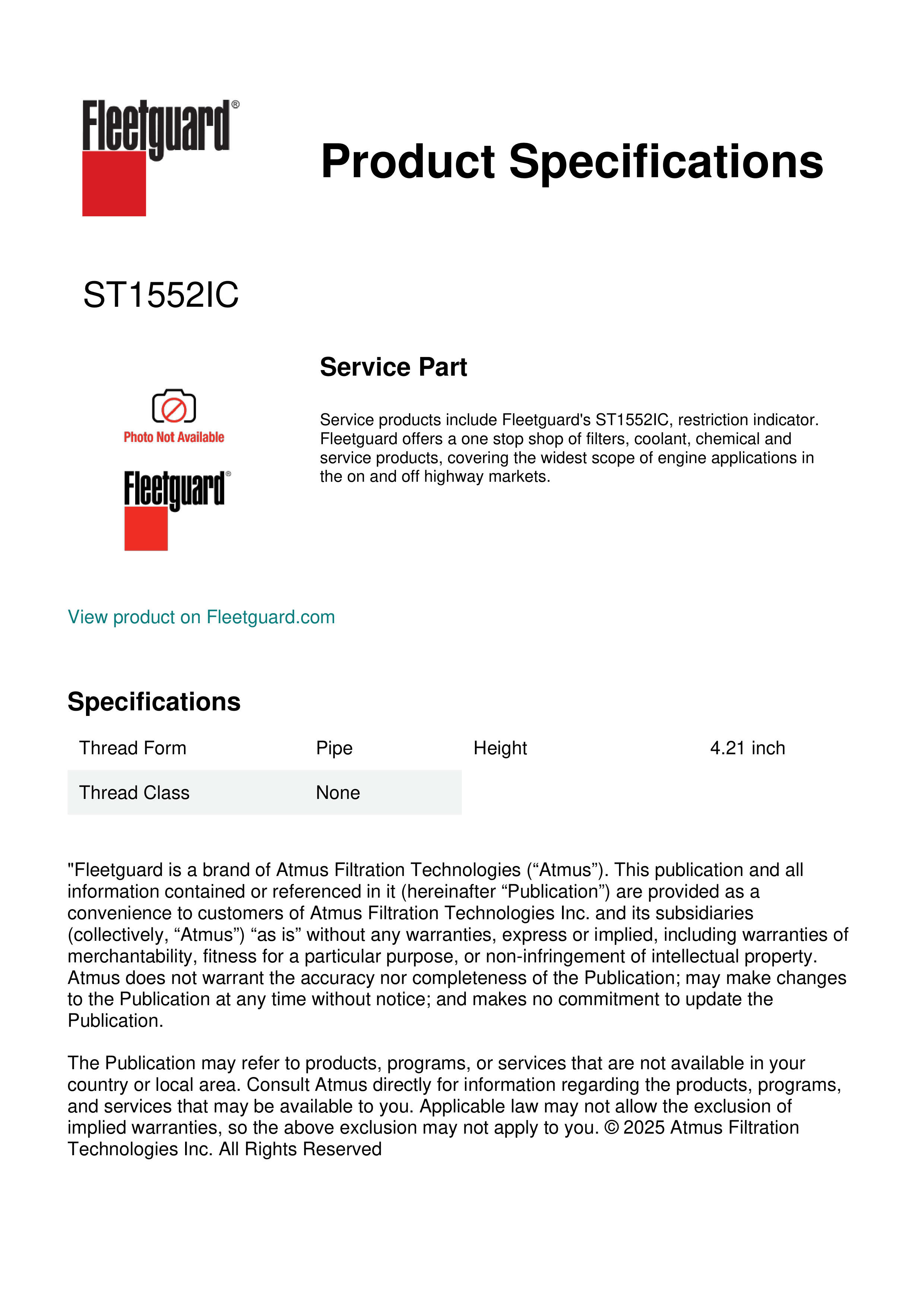 Service products include Fleetguard's ST1552IC, restriction indicator. Fleetguard offers a one stop shop of filters, coolant, chemical and service products, covering the widest scope of engine applications in the on and off highway markets.Specification