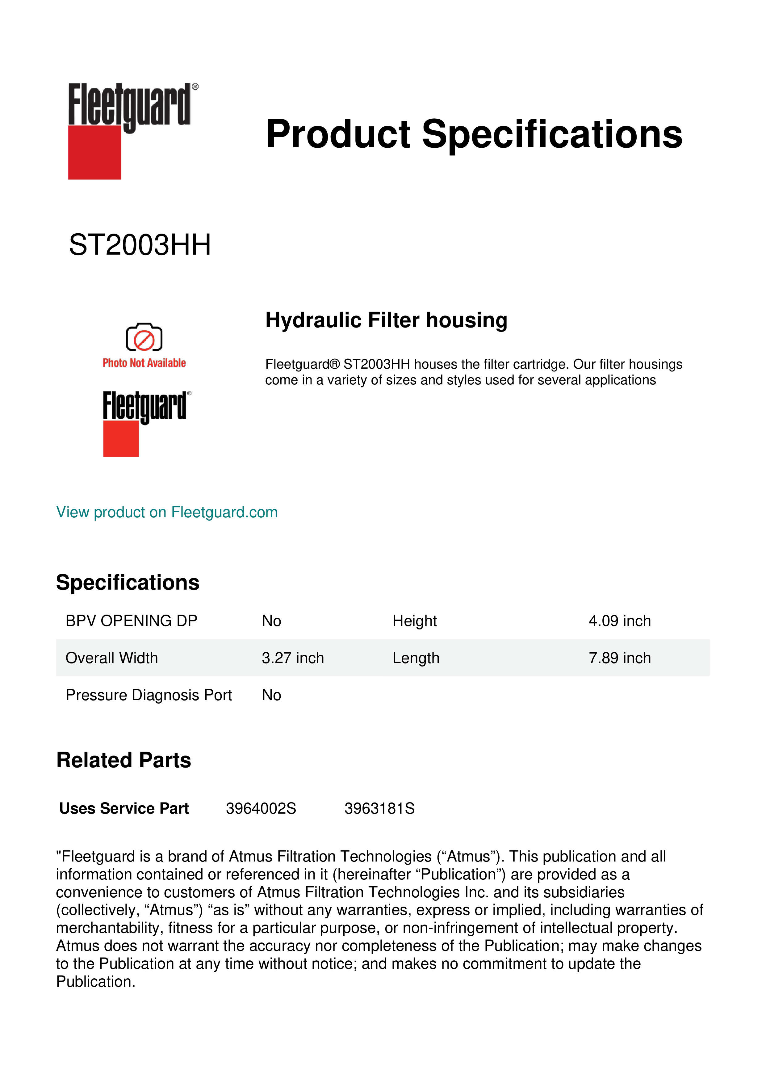 Fleetguard® ST2003HH houses the filter cartridge. Our filter housings come in a variety of sizes and styles used for several applicationsSpecification