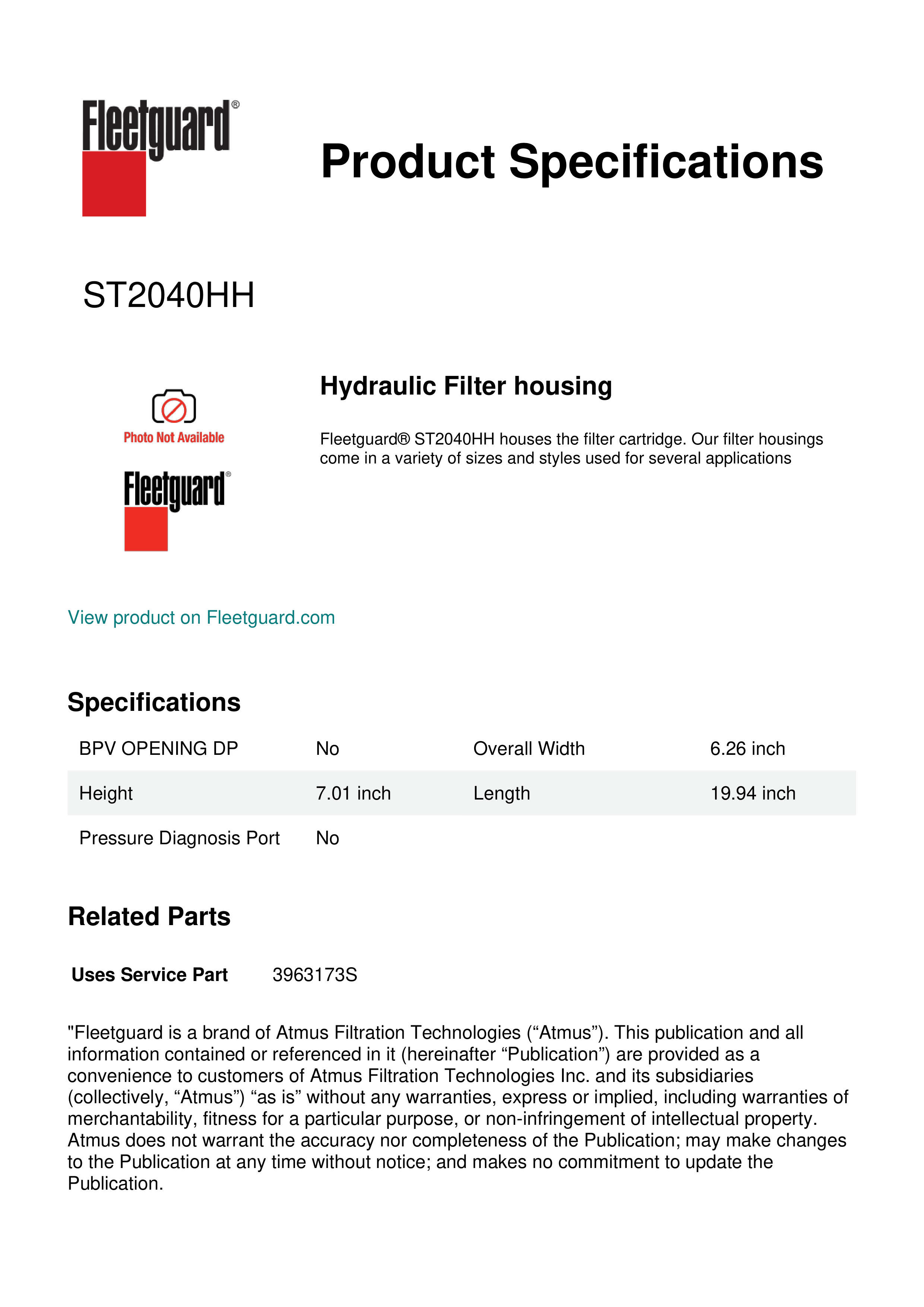 Fleetguard® ST2040HH houses the filter cartridge. Our filter housings come in a variety of sizes and styles used for several applicationsSpecification