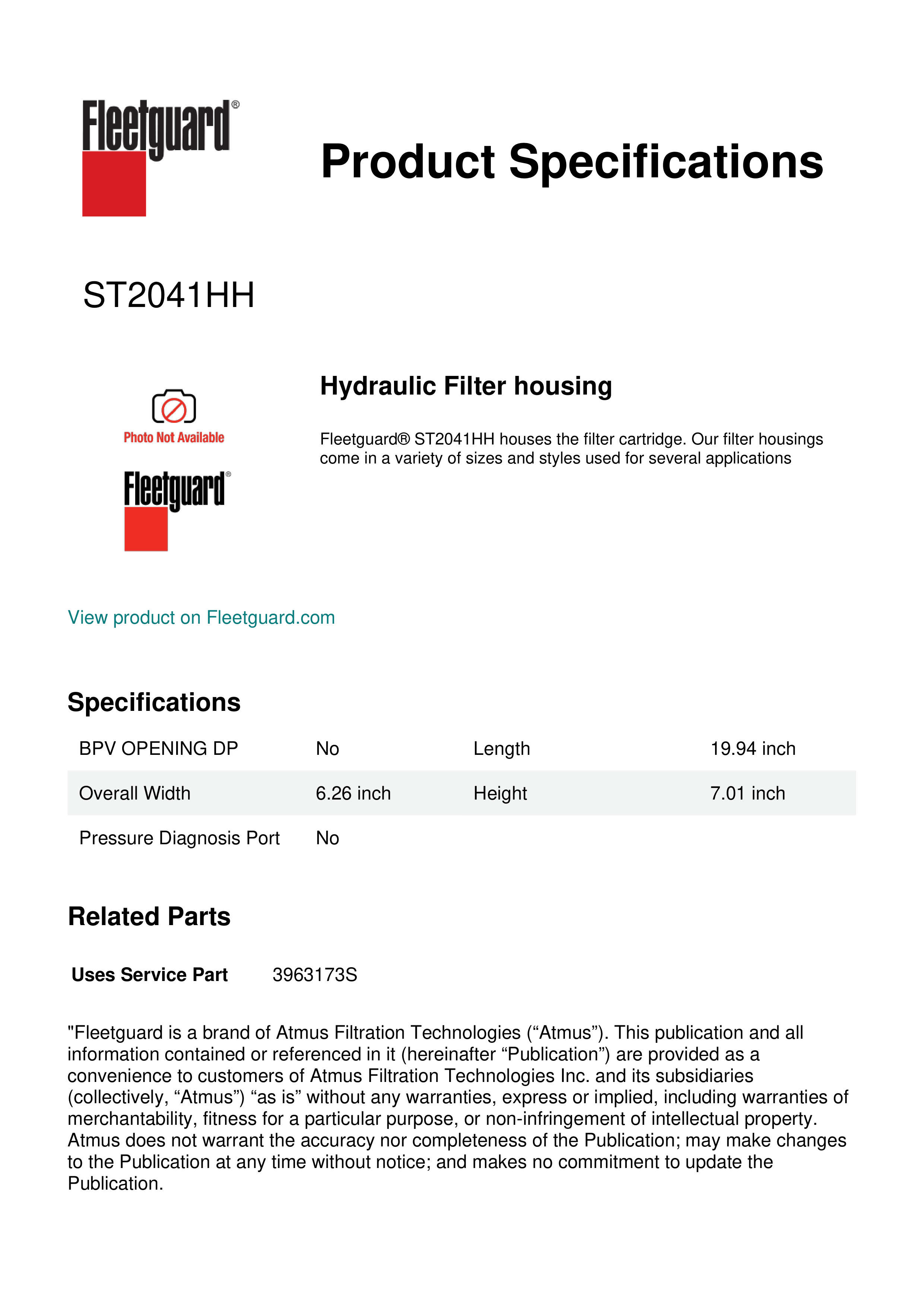 Fleetguard® ST2041HH houses the filter cartridge. Our filter housings come in a variety of sizes and styles used for several applicationsSpecification