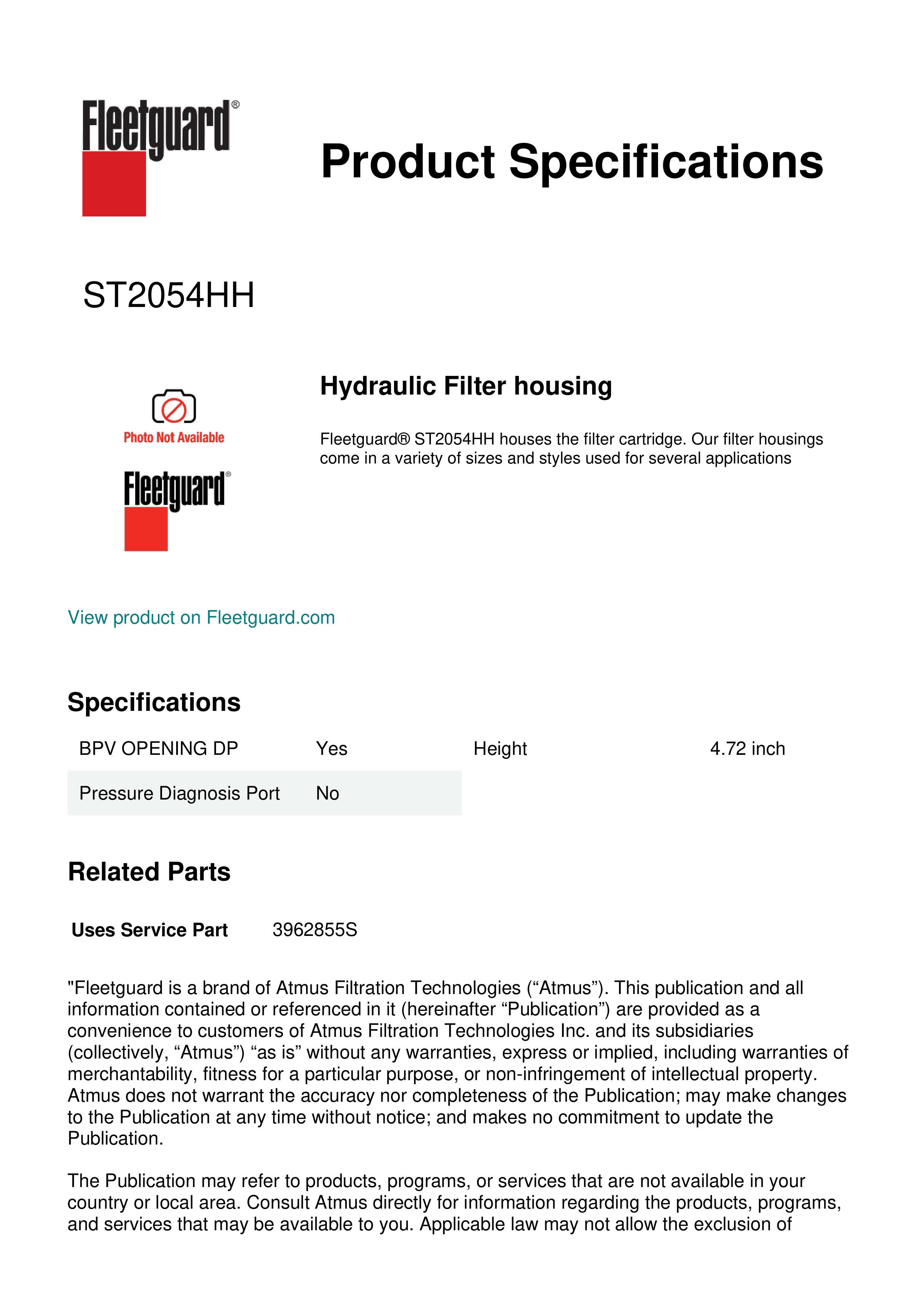 Fleetguard® ST2054HH houses the filter cartridge. Our filter housings come in a variety of sizes and styles used for several applicationsSpecification