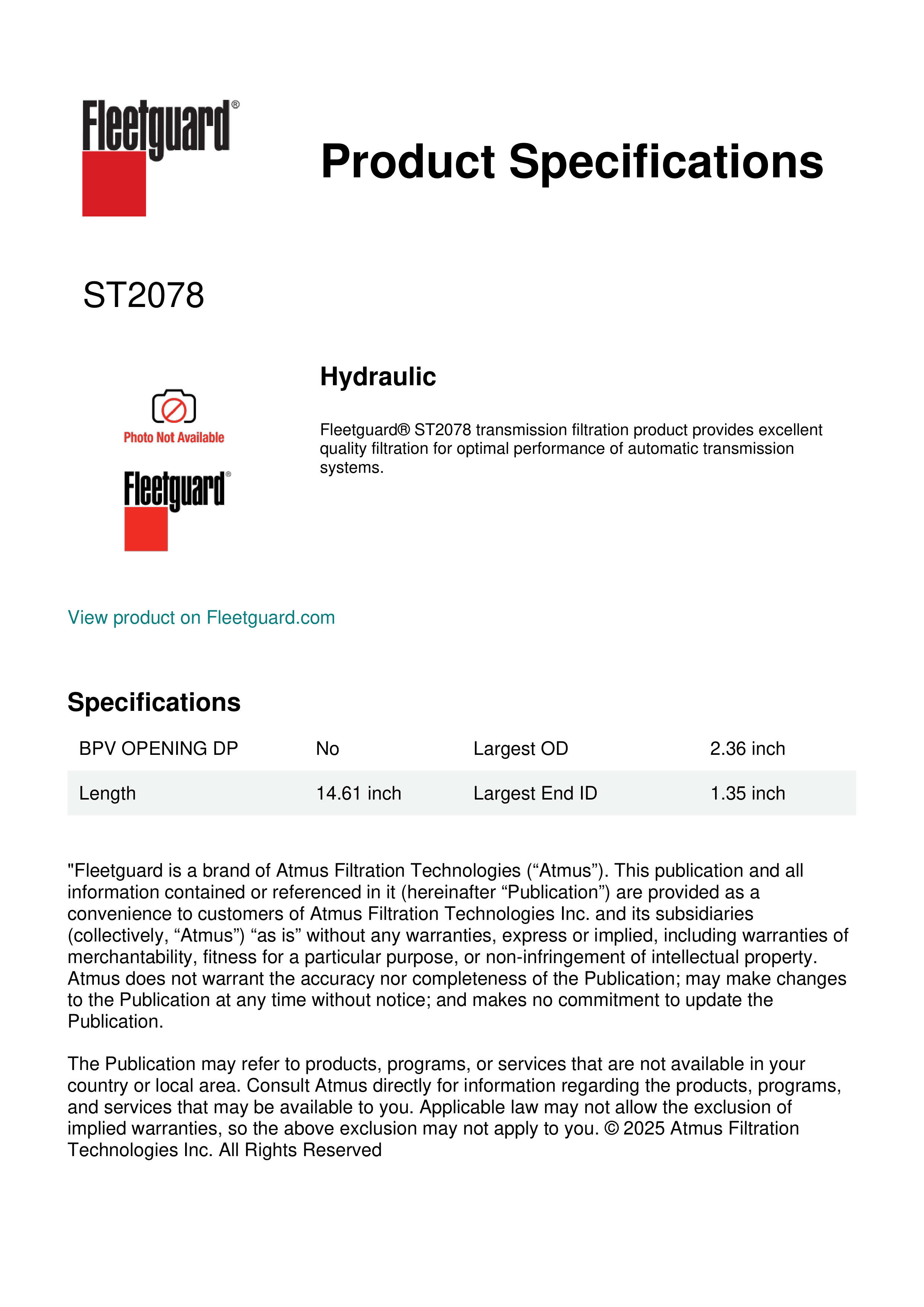 Fleetguard® ST2078 transmission filtration product provides excellent quality filtration for optimal performance of automatic transmission systems.Specification
