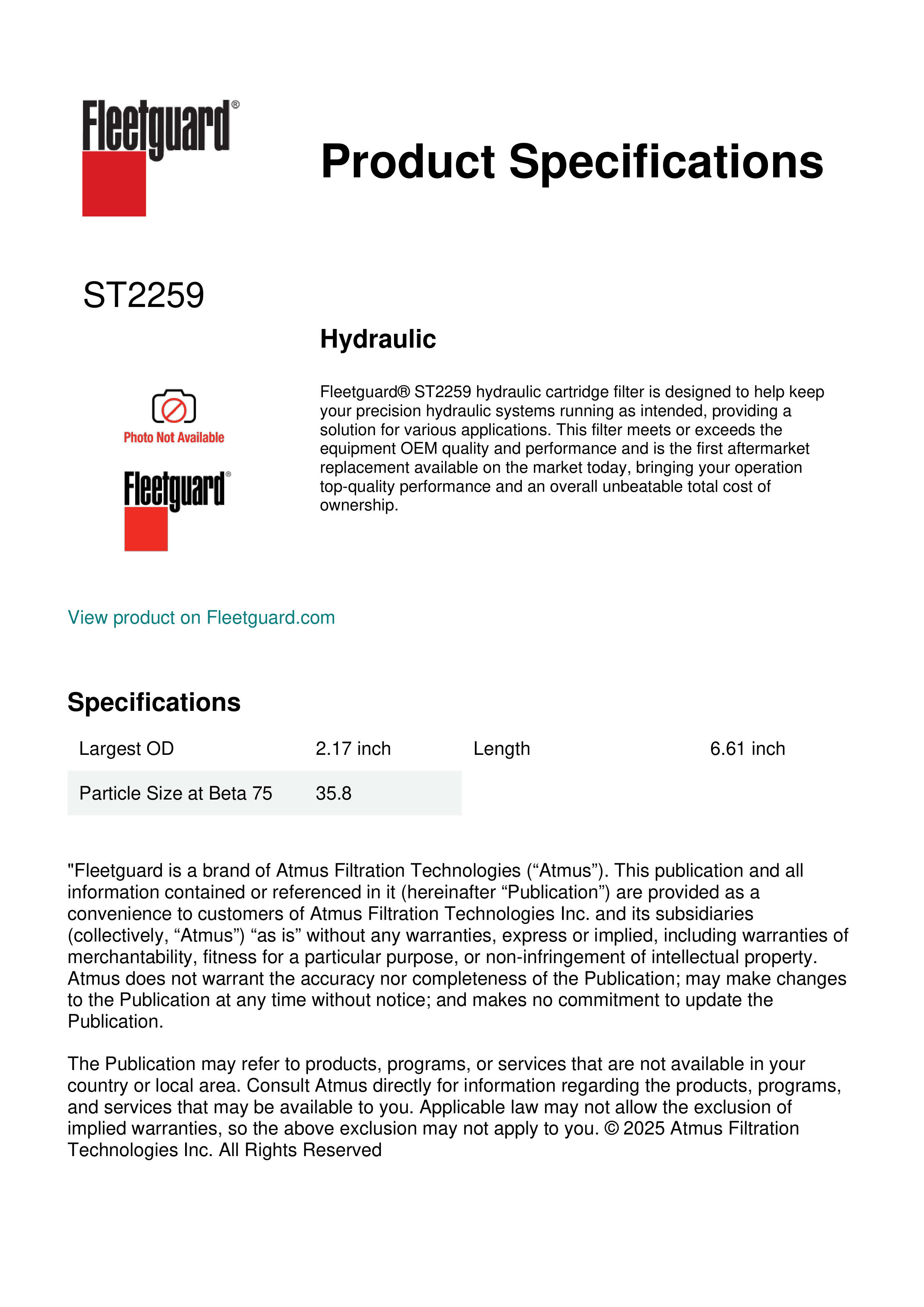 Fleetguard® ST2259 hydraulic cartridge filter is designed to help keep your precision hydraulic systems running as intended, providing a solution for various applications. This filter meets or exceeds the equipment OEM quality and performance and is the first aftermarket replacement available on the market today, bringing your operation top-quality performance and an overall unbeatable total cost of ownership.Specification