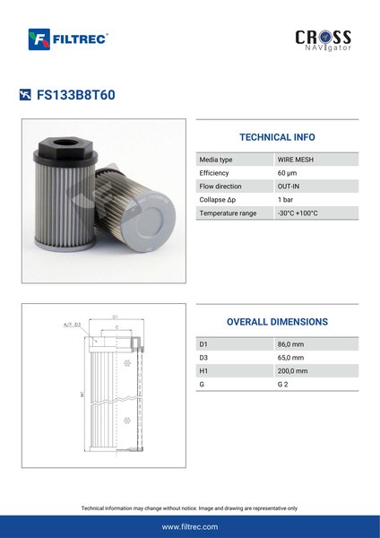 Engineered with their high performance media and a durable design, the FS133B8T60 provides reliable and consistent performance over its lifespan, even in harsh operating environments. When you order from FilterFinder, you can trust that you are getting a reliable and high-quality replacement filter that will keep your system running smoothly.