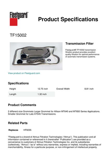 Fleetguard® TF15002 transmission filtration product provides excellent quality filtration for optimal performance of automatic transmission systems.Specification