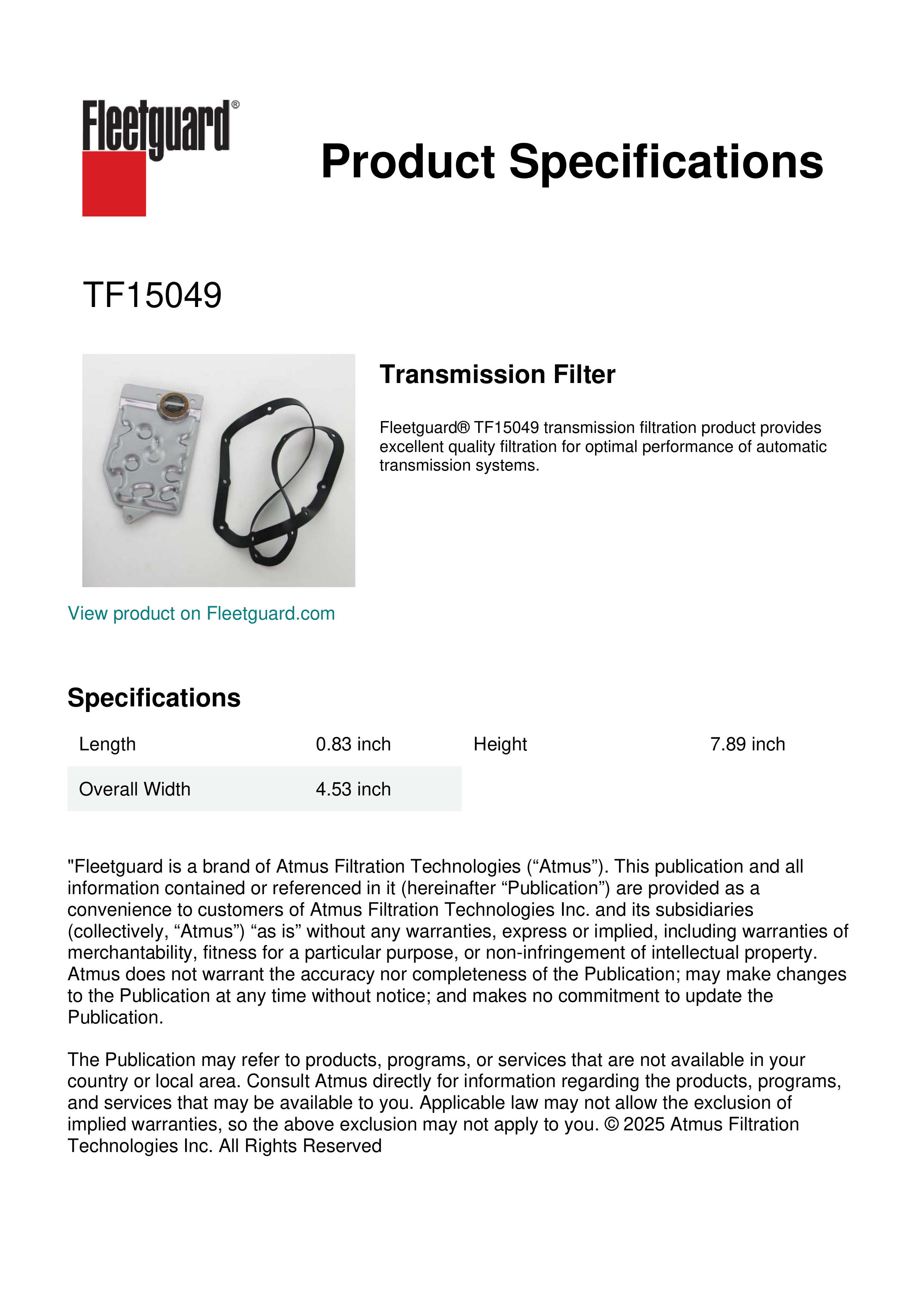 Fleetguard® TF15049 transmission filtration product provides excellent quality filtration for optimal performance of automatic transmission systems.Specification