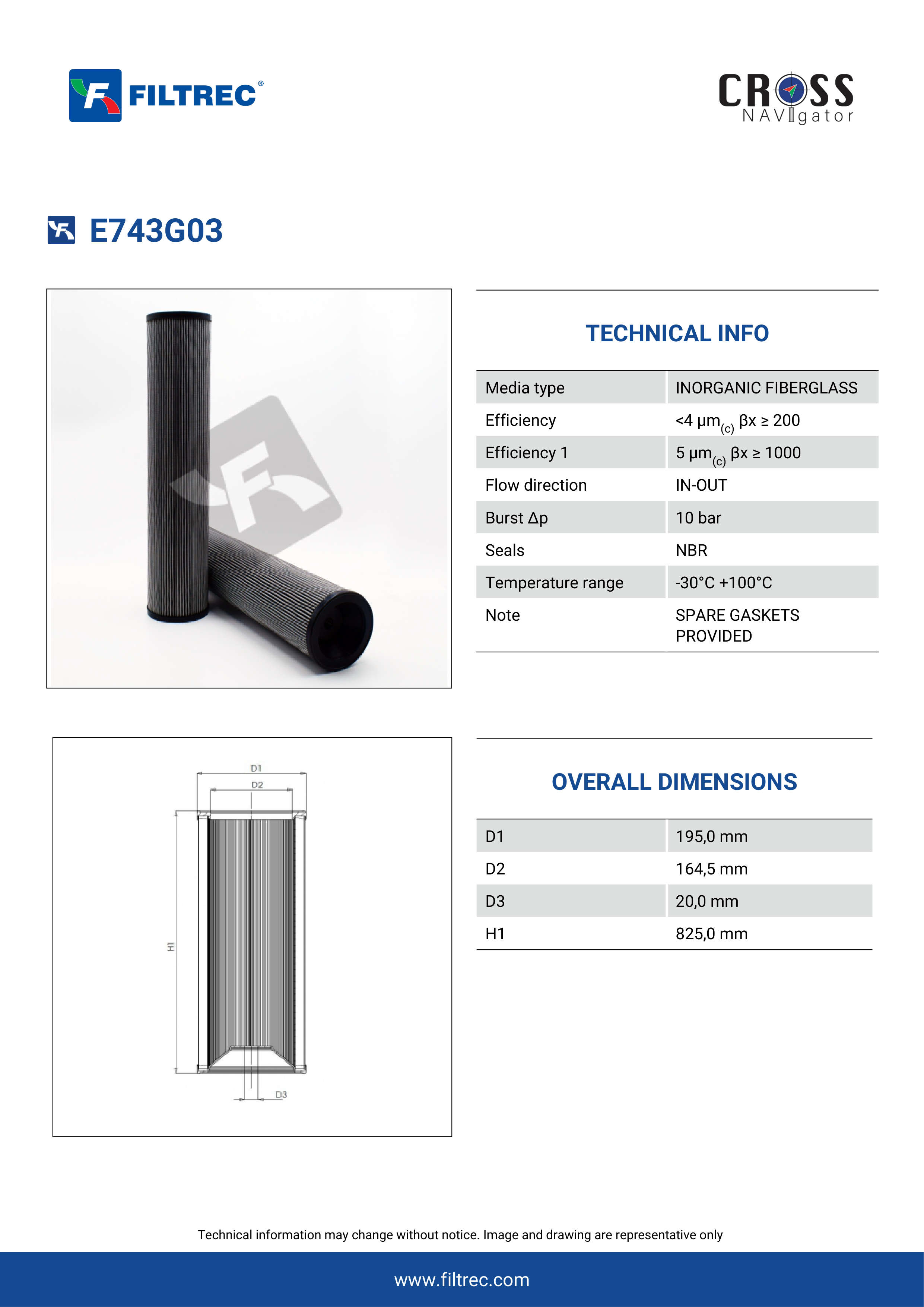 The efficiency of the element is shown using the Micron (µ) and Beta (β) ratings. The micron rating indicates the size of the particle being filtered and the beta rating the efficiency, calculated as 1/β.