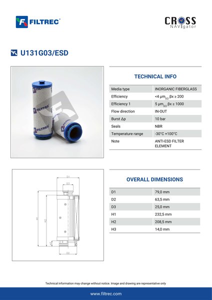 Genuine Filtrec U131G03/ESD. This Filtrec element is designed to meet or exceed the quality and performance of brand OEM’s ensuring superior filtration performance and long-lasting durability.Engineered with their high performance media and a durable design, the U131G03/ESD provides reliable and consistent performance over its lifespan, even in harsh operating environments. When you order from FilterFinder, you can trust that you are getting a reliable and high-quality replacement filter that will keep your system running smoothly.