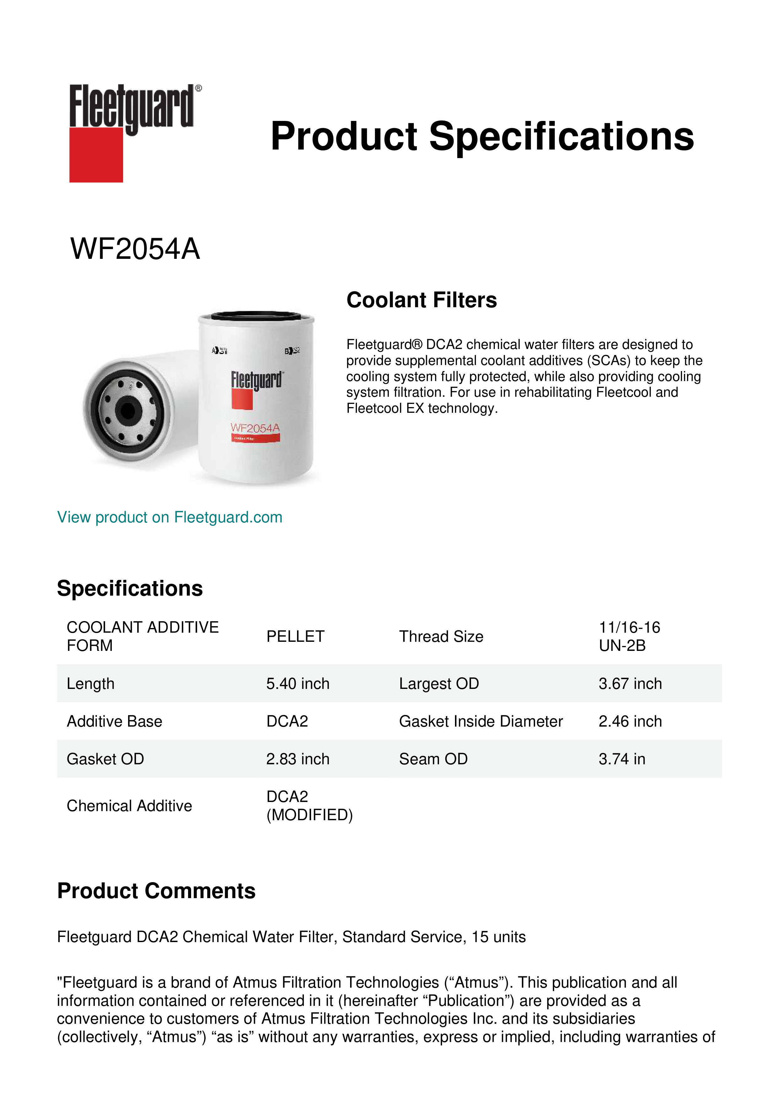 Choose Fleetguard® WF2054A DCA2 water filter with chemicals for coolant system protection that provides filtration and additive reinhibition. DCA2 water filters are designed for use with Fleetcool, Fleetcool EX or similar technology.Specification