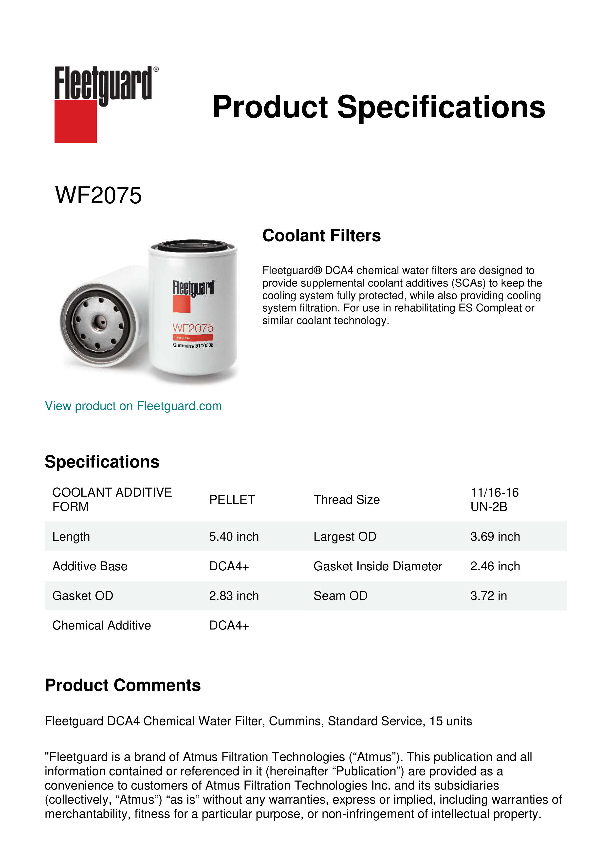 Choose Fleetguard® WF2075 DCA4 water filters with chemicals for coolant system protection that provides filtration and additive reinhibition. DCA4 water filters are designed for use with ES Compleat or similar coolant technology.Specification