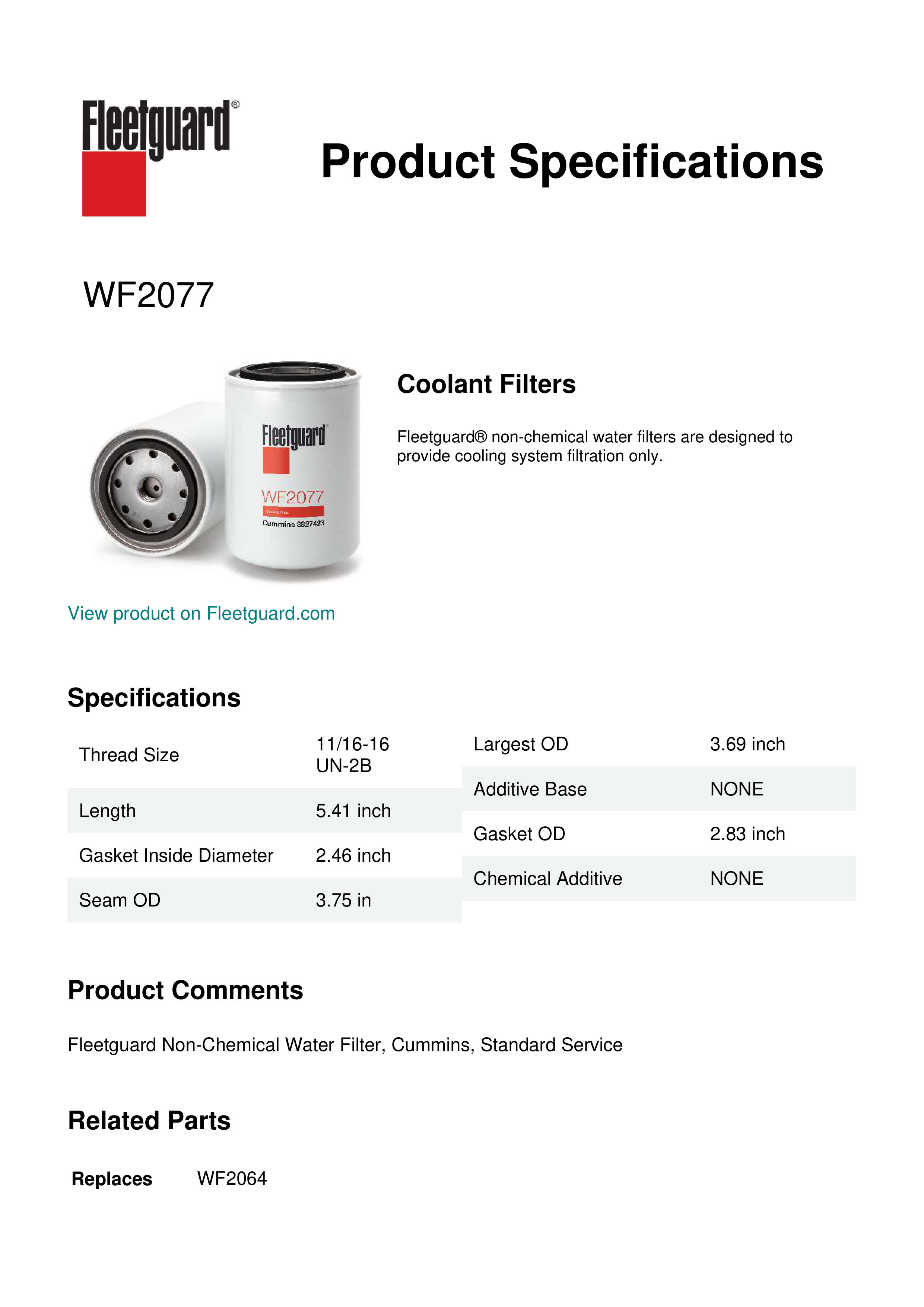 Choose Fleetguard® WF2077 non-chemical water filter for coolant system protection that provides filtration only. Non-chemical water filters are designed for use with OAT technology (which doesn't require DCA's for maintenance) or Hybrid and Conventional systems using liquid DCA's for reinhibition.Specification