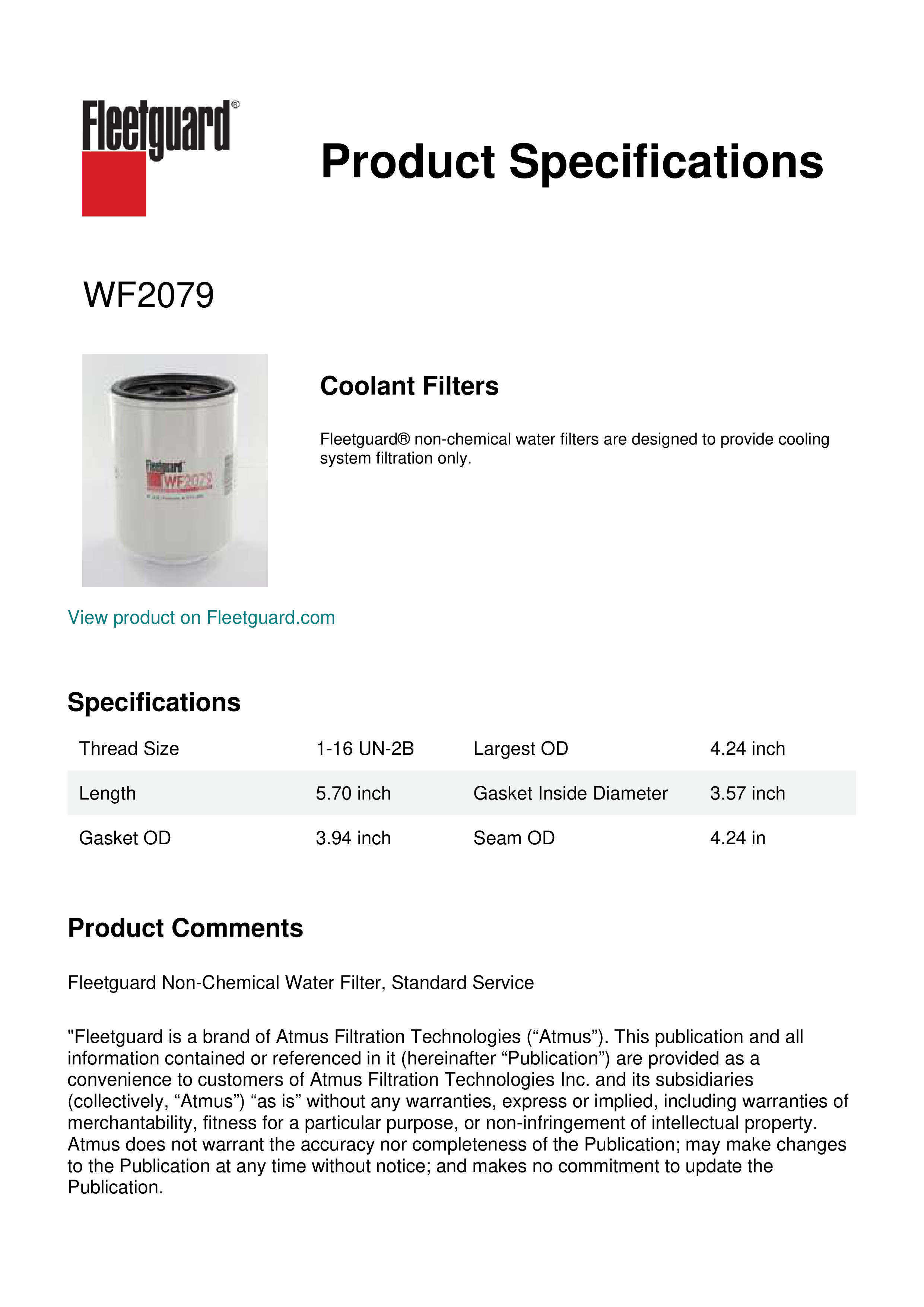 Choose Fleetguard® WF2079 DCA4 water filters with chemicals for coolant system protection that provides filtration and additive reinhibition. DCA4 water filters are designed for use with ES Compleat or similar coolant technology.Specification