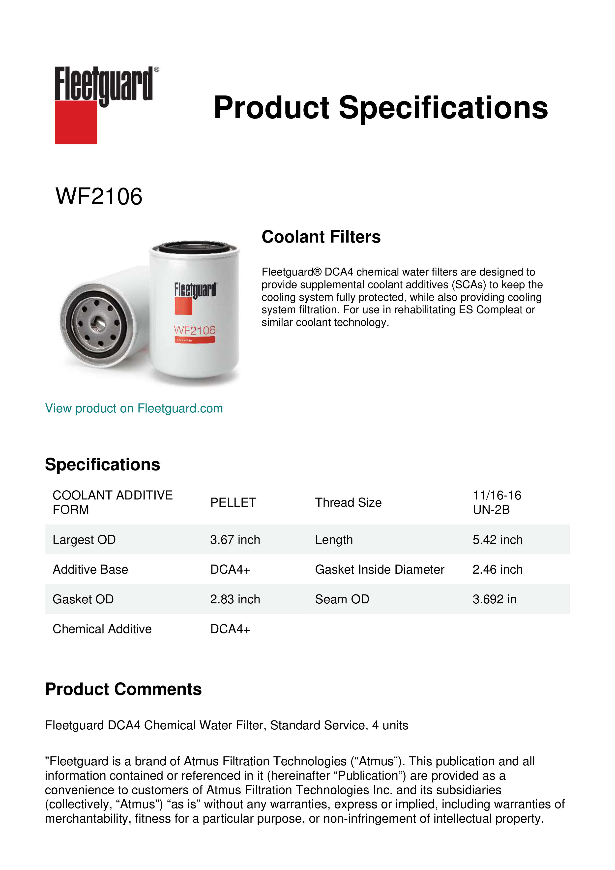 Choose Fleetguard® WF2106 DCA4 water filters with chemicals for coolant system protection that provides filtration and additive reinhibition. DCA4 water filters are designed for use with ES Compleat or similar coolant technology.Specification