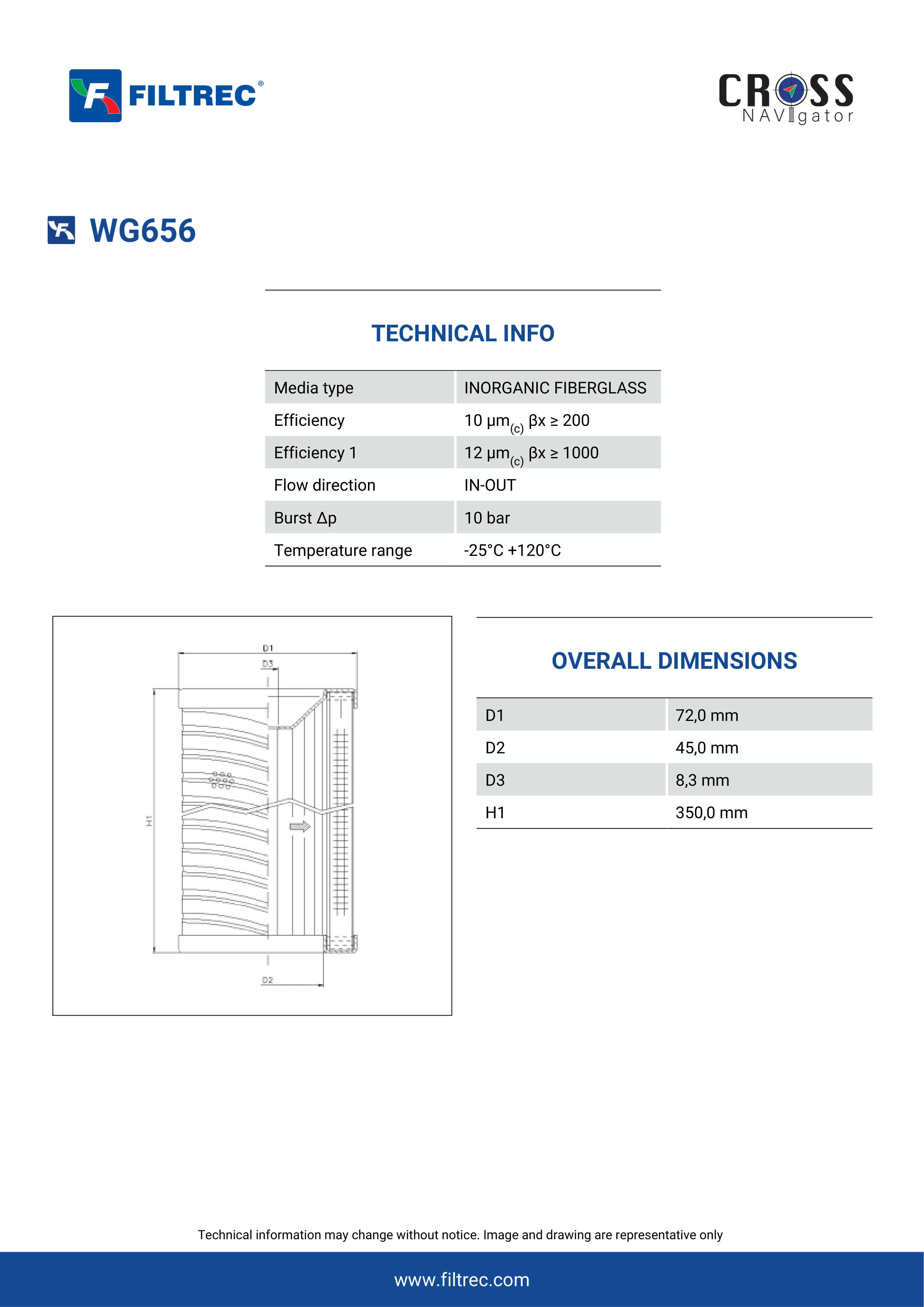 The efficiency of the element is shown using the Micron (µ) and Beta (β) ratings. The micron rating indicates the size of the particle being filtered and the beta rating the efficiency, calculated as 1/β.