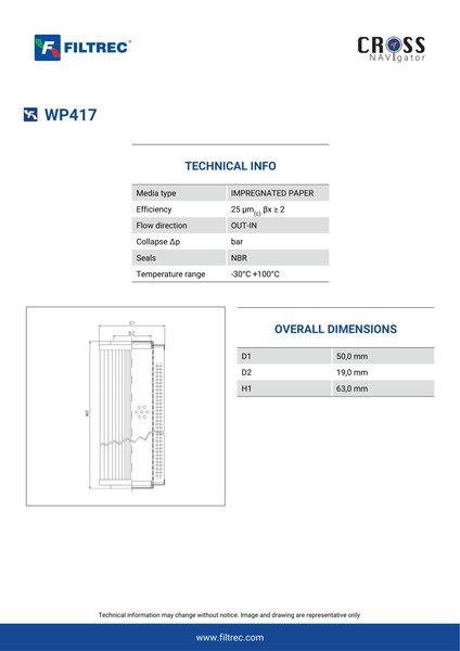 The efficiency of the element is shown using the Micron (µ) and Beta (β) ratings. The micron rating indicates the size of the particle being filtered and the beta rating the efficiency, calculated as 1/β.
