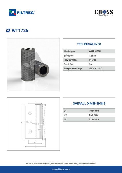 Genuine Filtrec WT1726. This Filtrec element is designed to meet or exceed the quality and performance of brand OEM’s ensuring superior filtration performance and long-lasting durability.