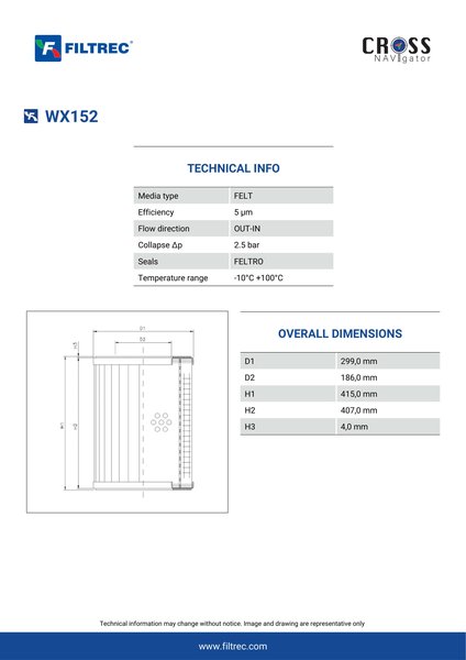 Engineered with their high performance media and a durable design, the WX152 provides reliable and consistent performance over its lifespan, even in harsh operating environments. When you order from FilterFinder, you can trust that you are getting a reliable and high-quality replacement filter that will keep your system running smoothly.